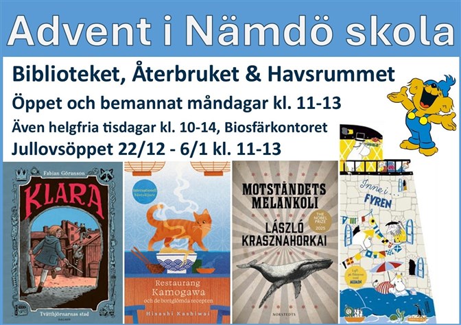 Nämdö bibliotek, Nämdö Återbruk och Havsrummet i Nämdö skola öppet måndagar kl 11-13 och tisdagar kl 10-13.45 när Biosfärkontoret är bemannat.