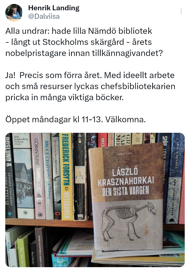 Den sista vargen av László Krasznahorkai. Vi hade en som lite försåtligt gömt sig bland hyllorna.