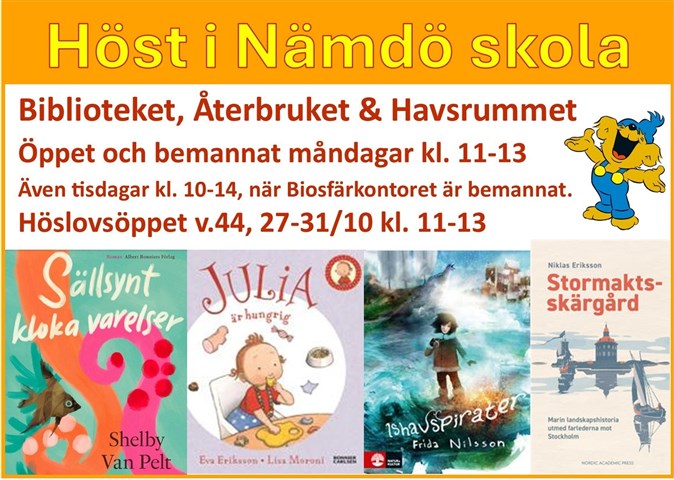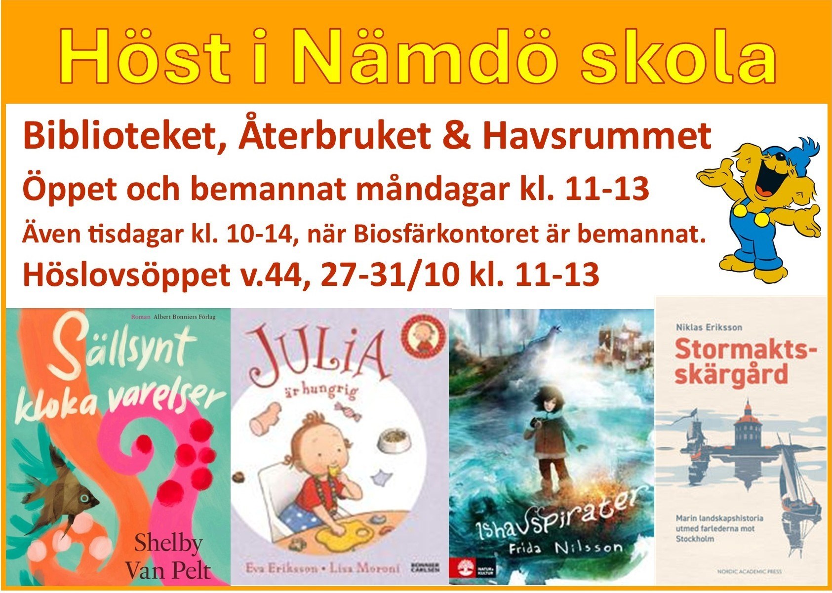 Nämdö bibliotek, Nämdö Återbruk och Havsrummet i Nämdö skola öppet måndagar kl 11-13 och tisdagar kl 10-13.45 när Biosfärkontoret är bemannat.